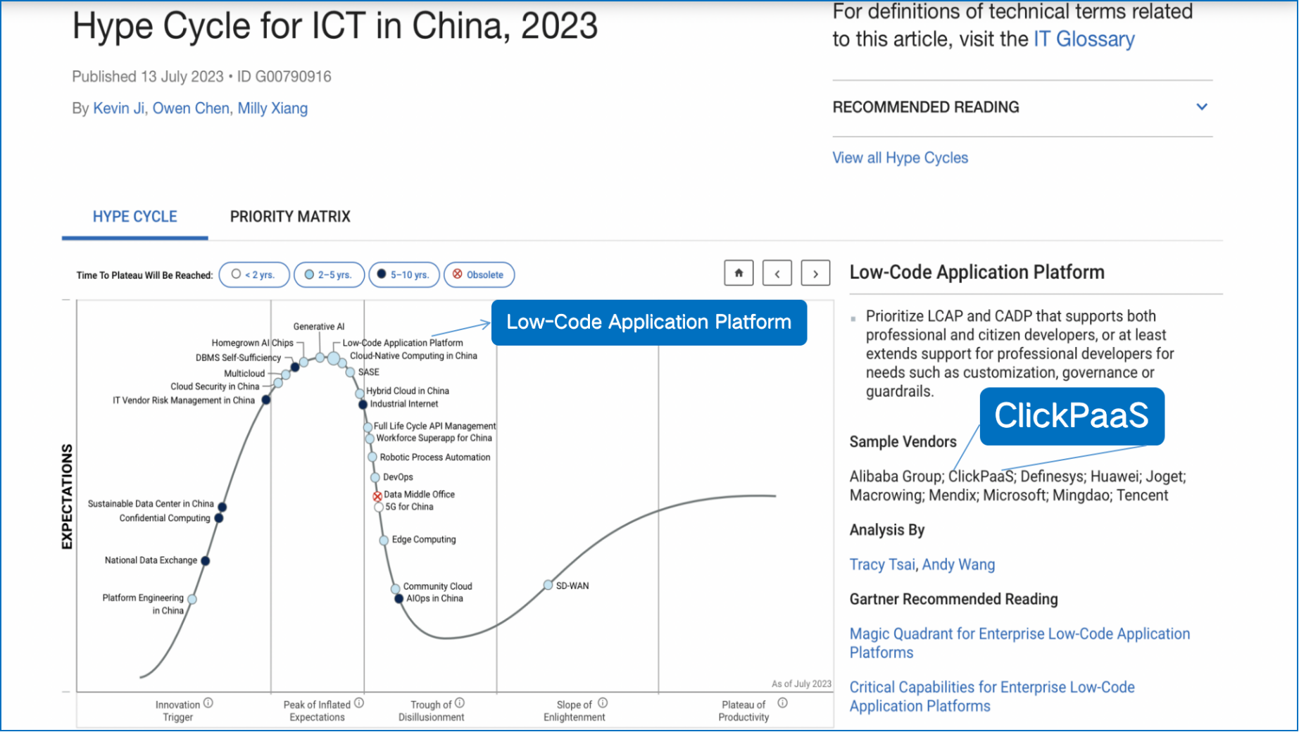 近日,国际权威研究机构Gartner发布了《Hype Cyple for ICT in China,2023(2023年中国ICT技术成熟度曲线)》报告,凯发k8网站凭借平台的aPaaS+iPaaS+DaaS保障业务系统的一站式设计,多租户、热发布、国际化、信创安全等特性实力登榜,并作为低代码PaaS平台代表厂商TOP2入选本次报告。