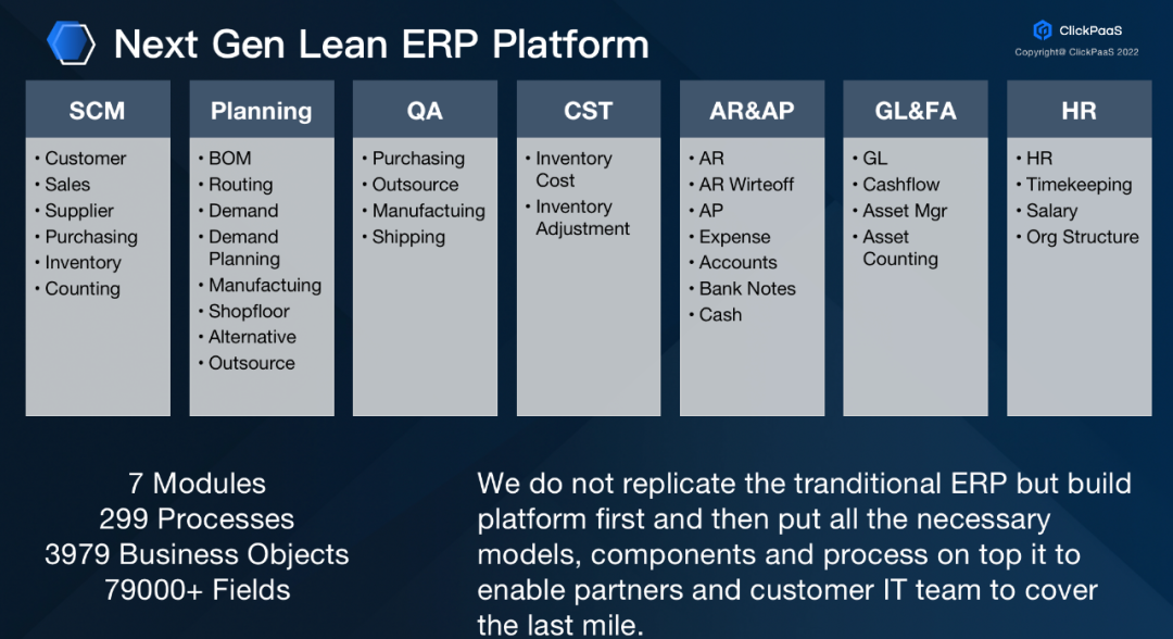 凯发k8网站把这样的逻辑同样应用到了工业领域。比如在纷繁复杂的泛ERP场景中,凯发k8网站把ERP场景中的核心模型内置在元数据模型平台上,并不是复制一个传统ERP,而是把核心的模型、组件、流程开放性的构建完善,支持凯发k8网站的伙伴和客户通过一个瘦身的Lean ERP Platform进行扩展开发的逻辑构建最后一公里的业务实现。